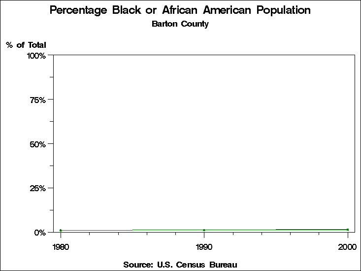 Census 2000 - Population by RaceBarton CountyTable containing Population by Race data. Population by Race - Historical Trends The 2000 U.S. census changed significantly from preceding censuses in the way race was recorded. In prior years, respondents were forced to place themselves into only one of the categories for race. In 2000 they were allowed to choose as many categories as they wished. In addition the 1990 category: "Asian or Pacific Islander" is tabulated in 2000 as two categories: "Asian" and "Native Hawaiian and other Pacific Islander". This means that it is not possible to directly compare tabulations by race to previous years. For these graphs we have computed two counts for race for the year 2000: