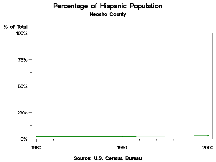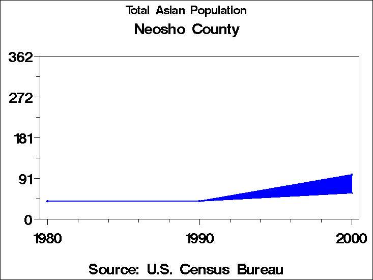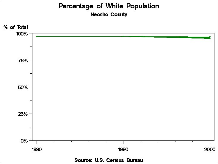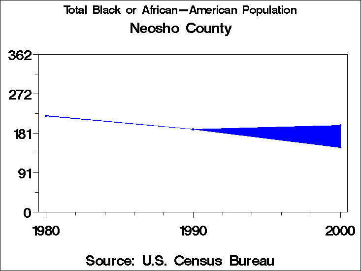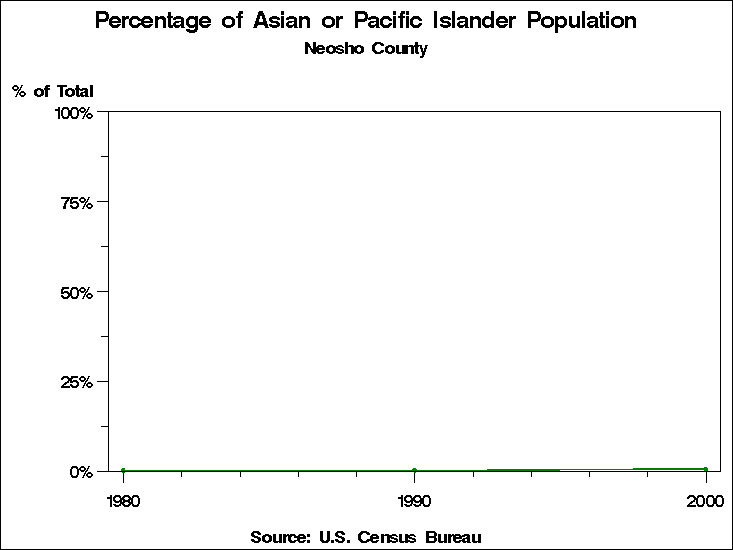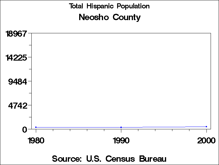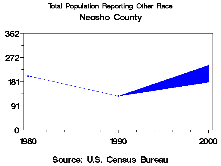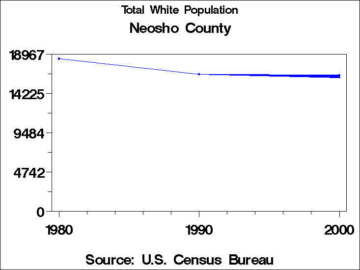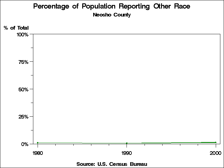 Census 2000 - Population by RaceNeosho CountyTable containing Population by Race data. Population by Race - Historical Trends The 2000 U.S. census changed significantly from preceding censuses in the way race was recorded. In prior years, respondents were forced to place themselves into only one of the categories for race. In 2000 they were allowed to choose as many categories as they wished. In addition the 1990 category: "Asian or Pacific Islander" is tabulated in 2000 as two categories: "Asian" and "Native Hawaiian and other Pacific Islander". This means that it is not possible to directly compare tabulations by race to previous years. For these graphs we have computed two counts for race for the year 2000:
