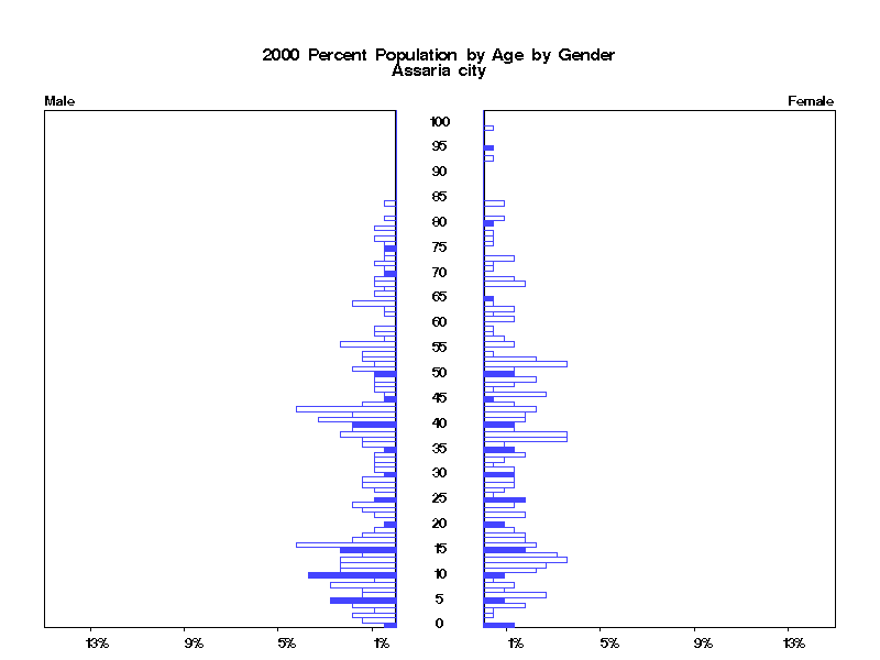 | Assaria city 2000 Population by Age by Gender | |||||