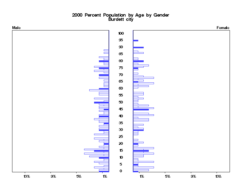 | Burdett city 2000 Population by Age by Gender | |||||