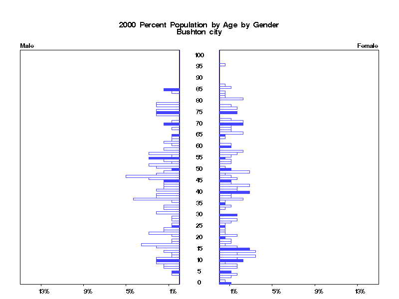 | Bushton city 2000 Population by Age by Gender | |||||