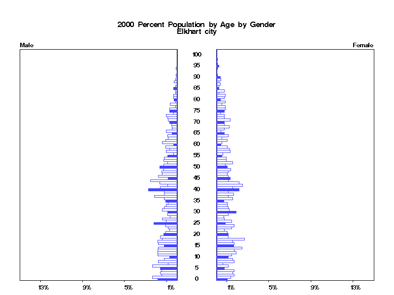 | Elkhart city 2000 Population by Age by Gender | |||||