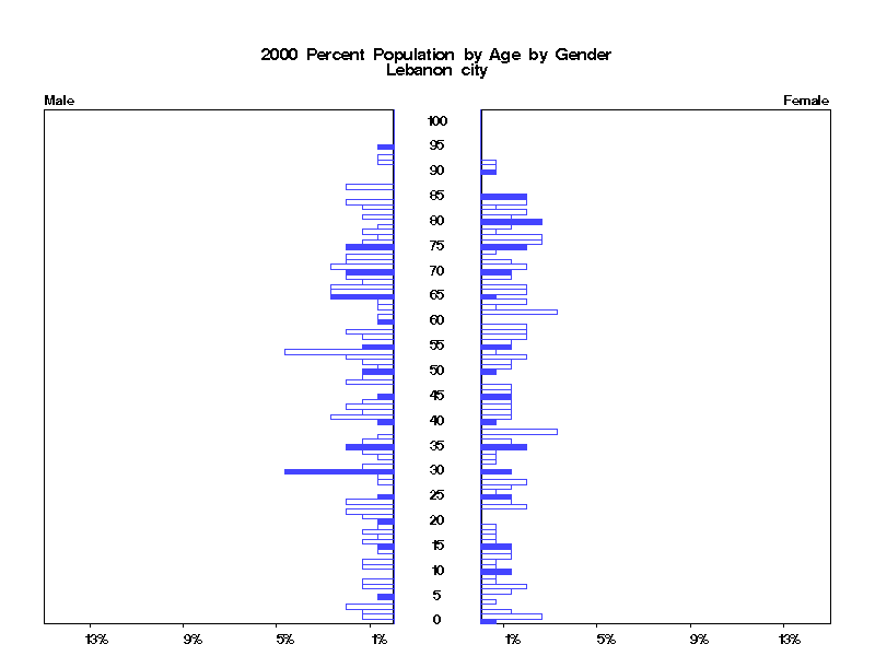 | Lebanon city 2000 Population by Age by Gender | |||||