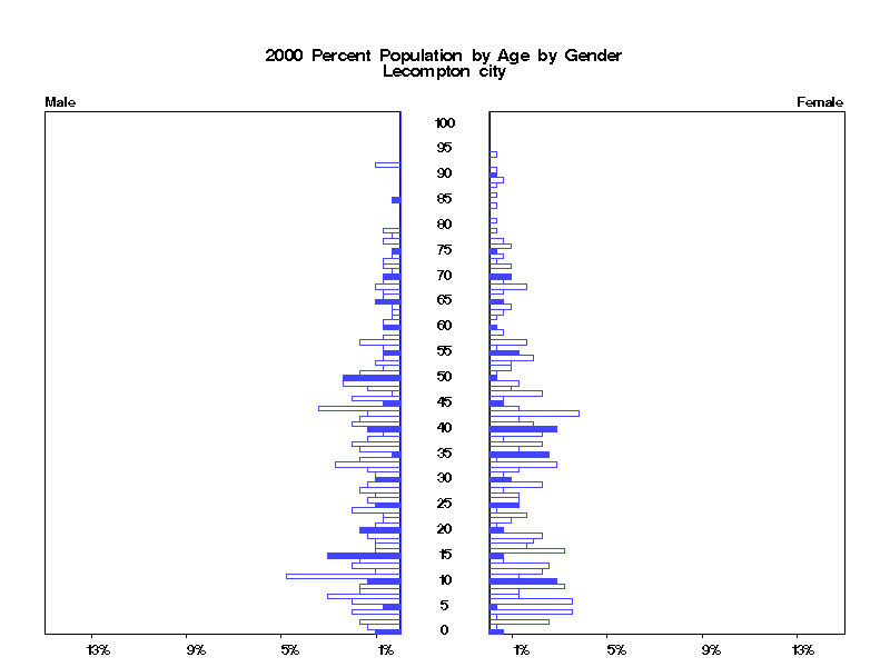 | Lecompton city 2000 Population by Age by Gender | |||||