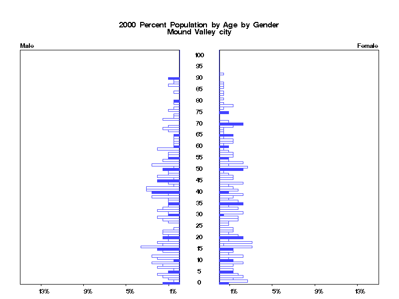 | Mound Valley city 2000 Population by Age by Gender | |||||