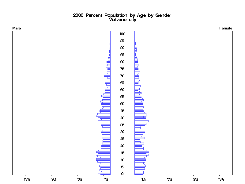 | Mulvane city 2000 Population by Age by Gender | |||||