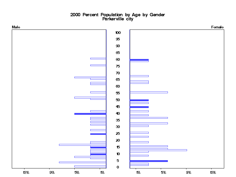 | Parkerville city 2000 Population by Age by Gender | |||||